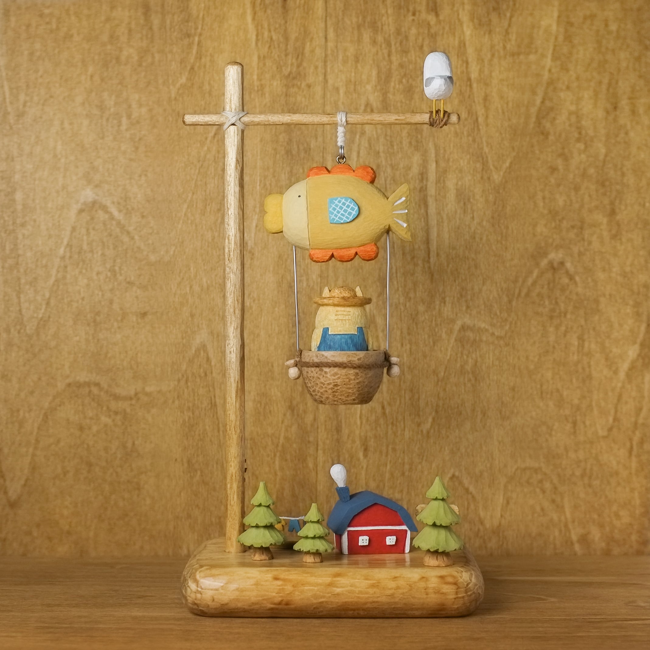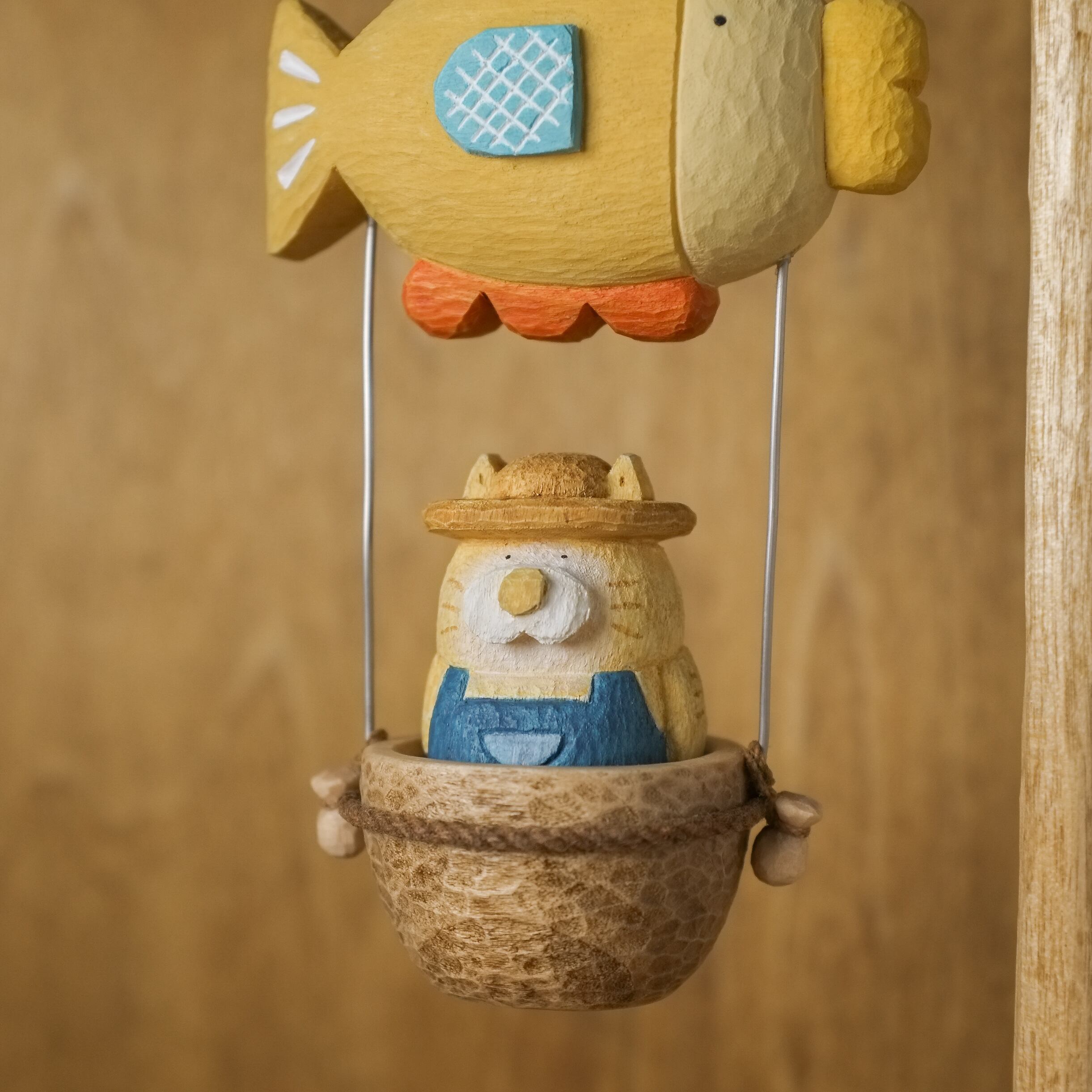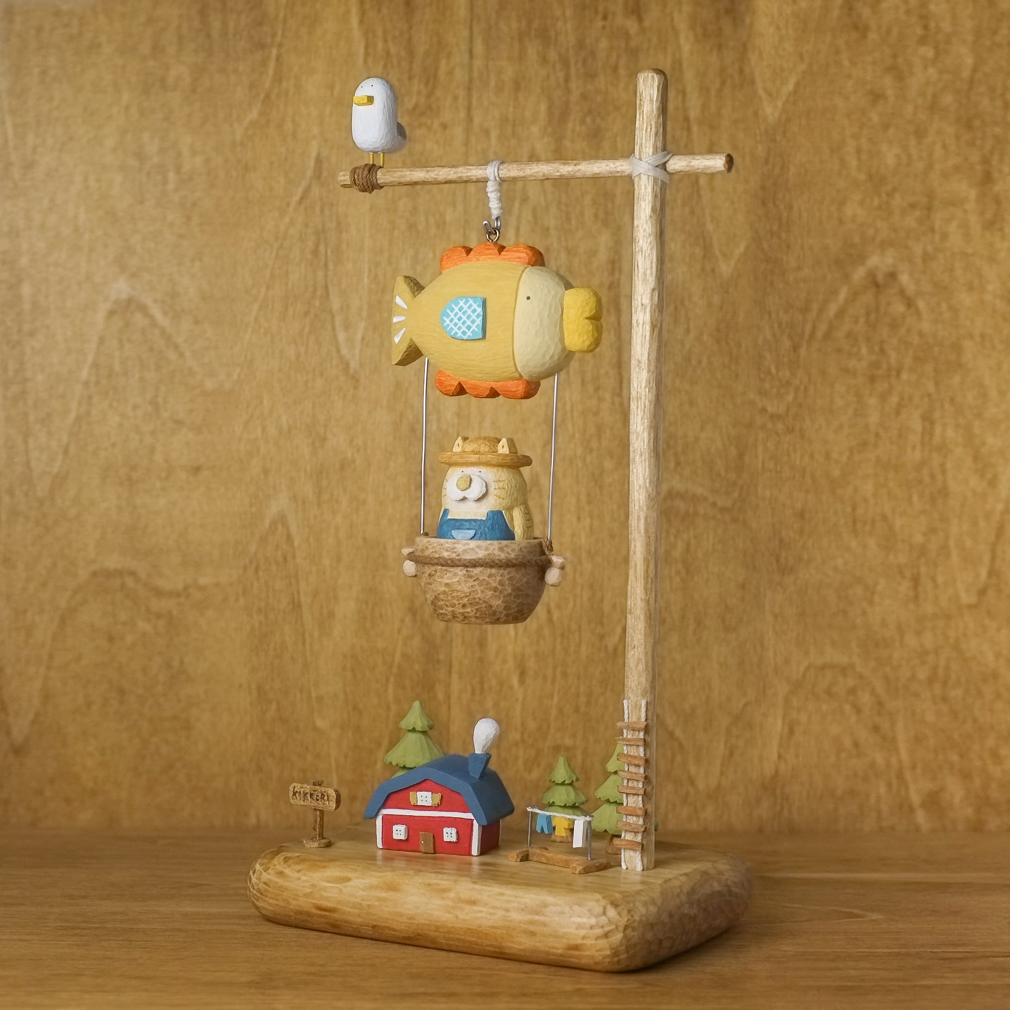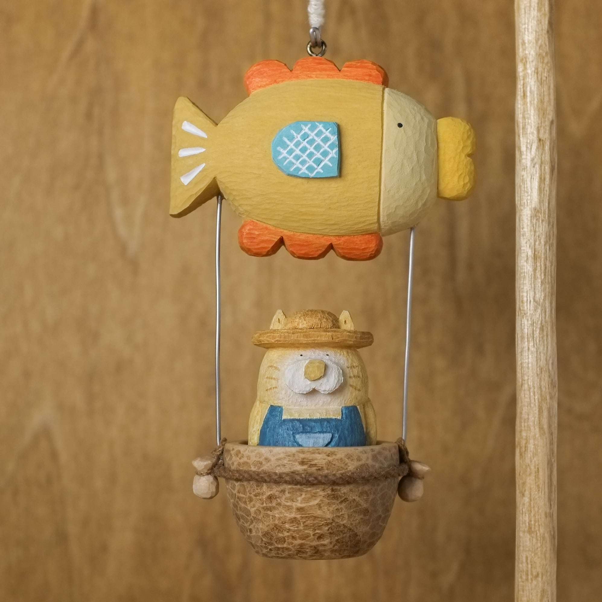 猫の木彫りがお魚の気球に乗って、