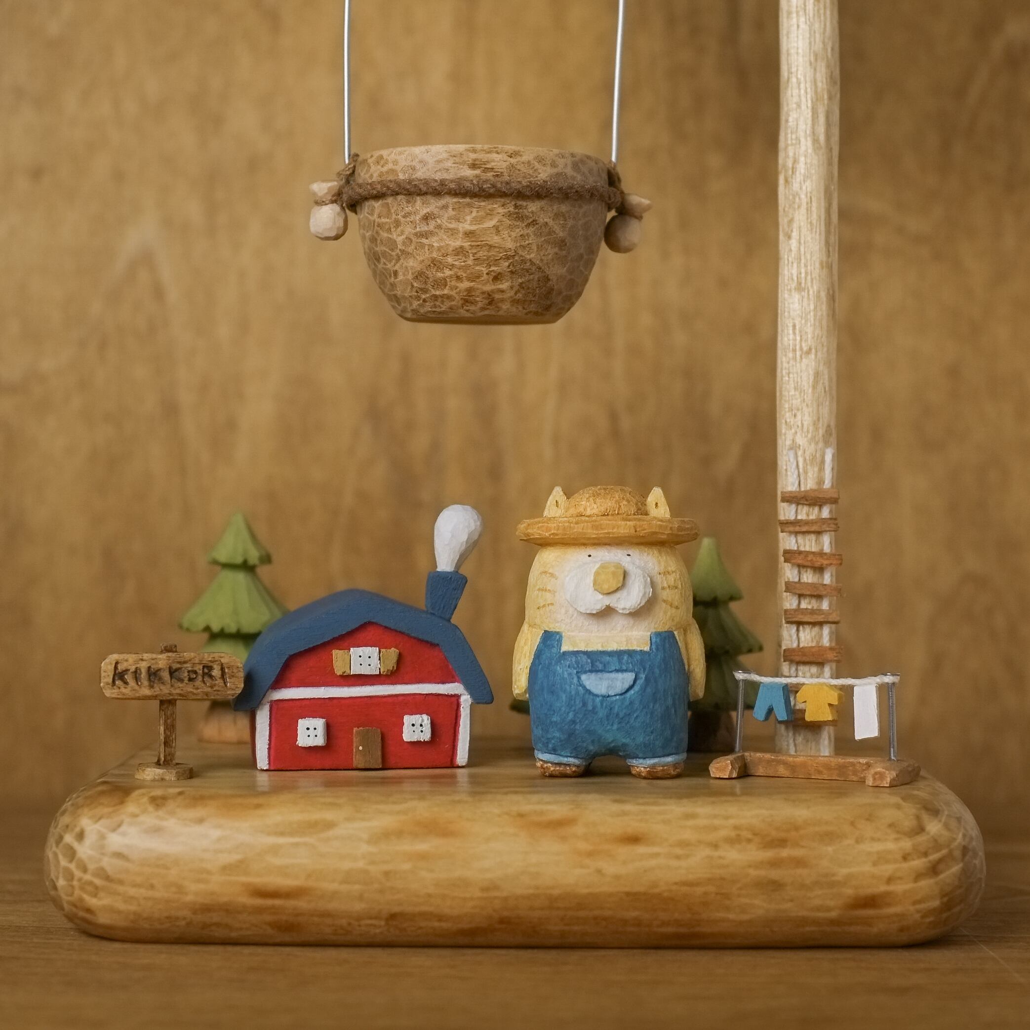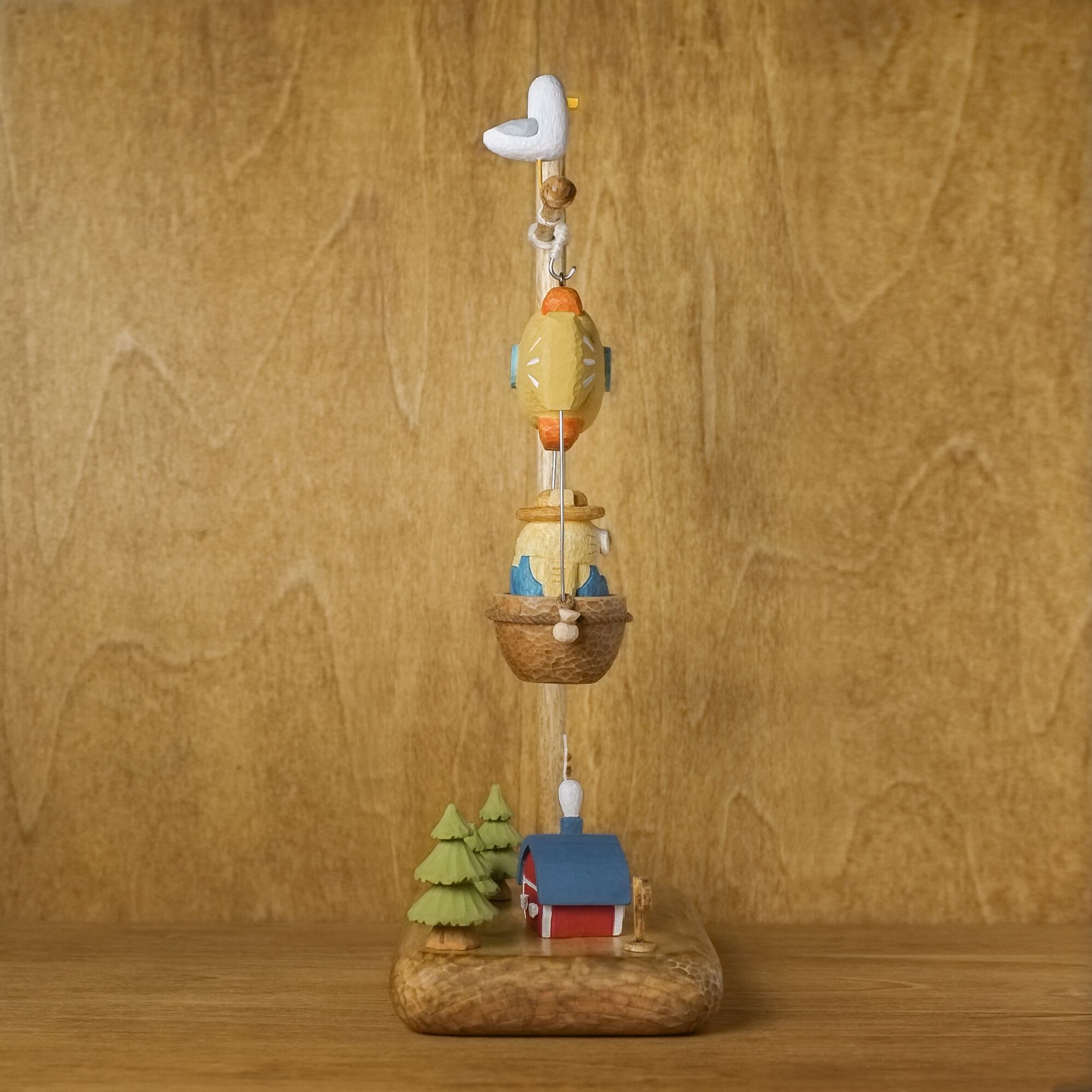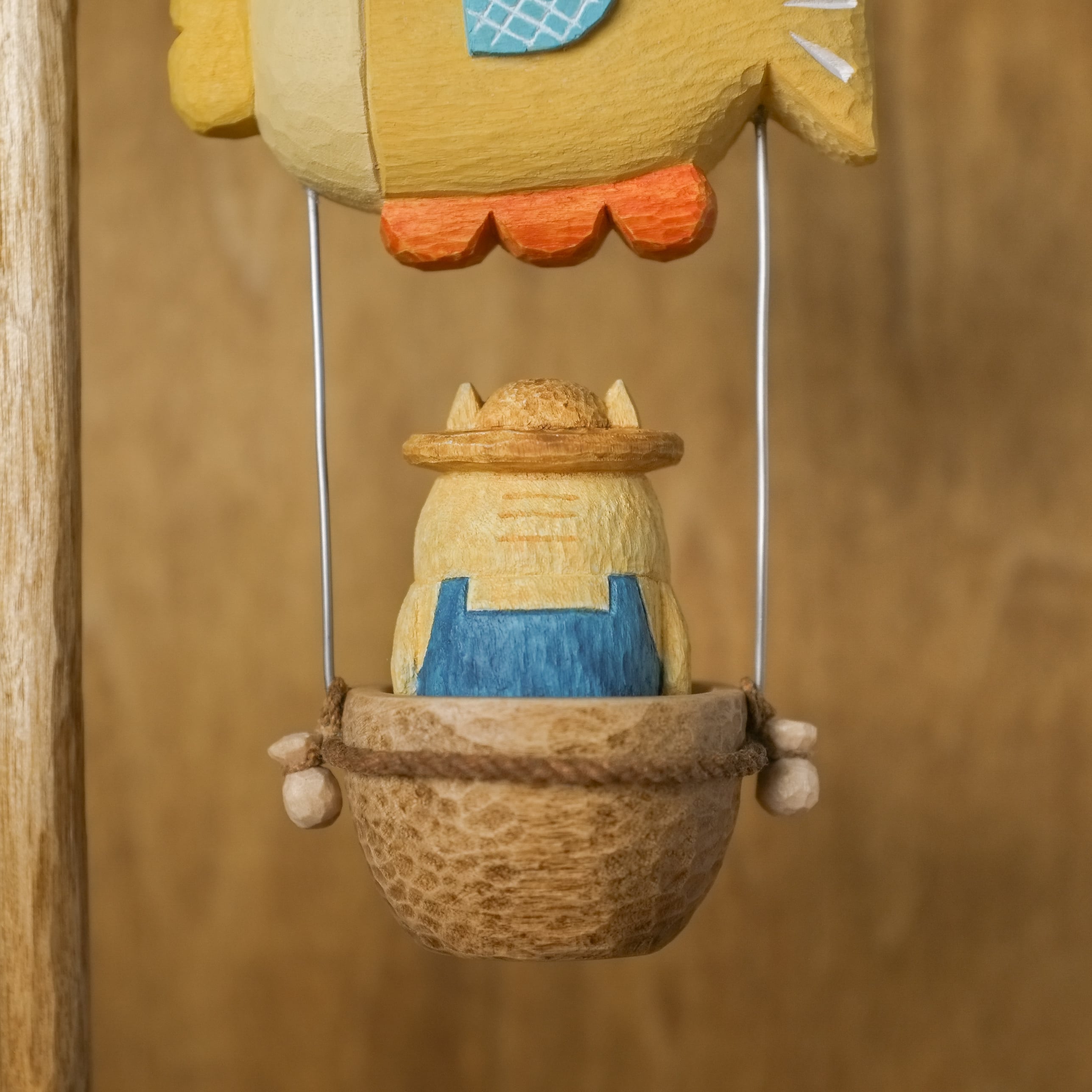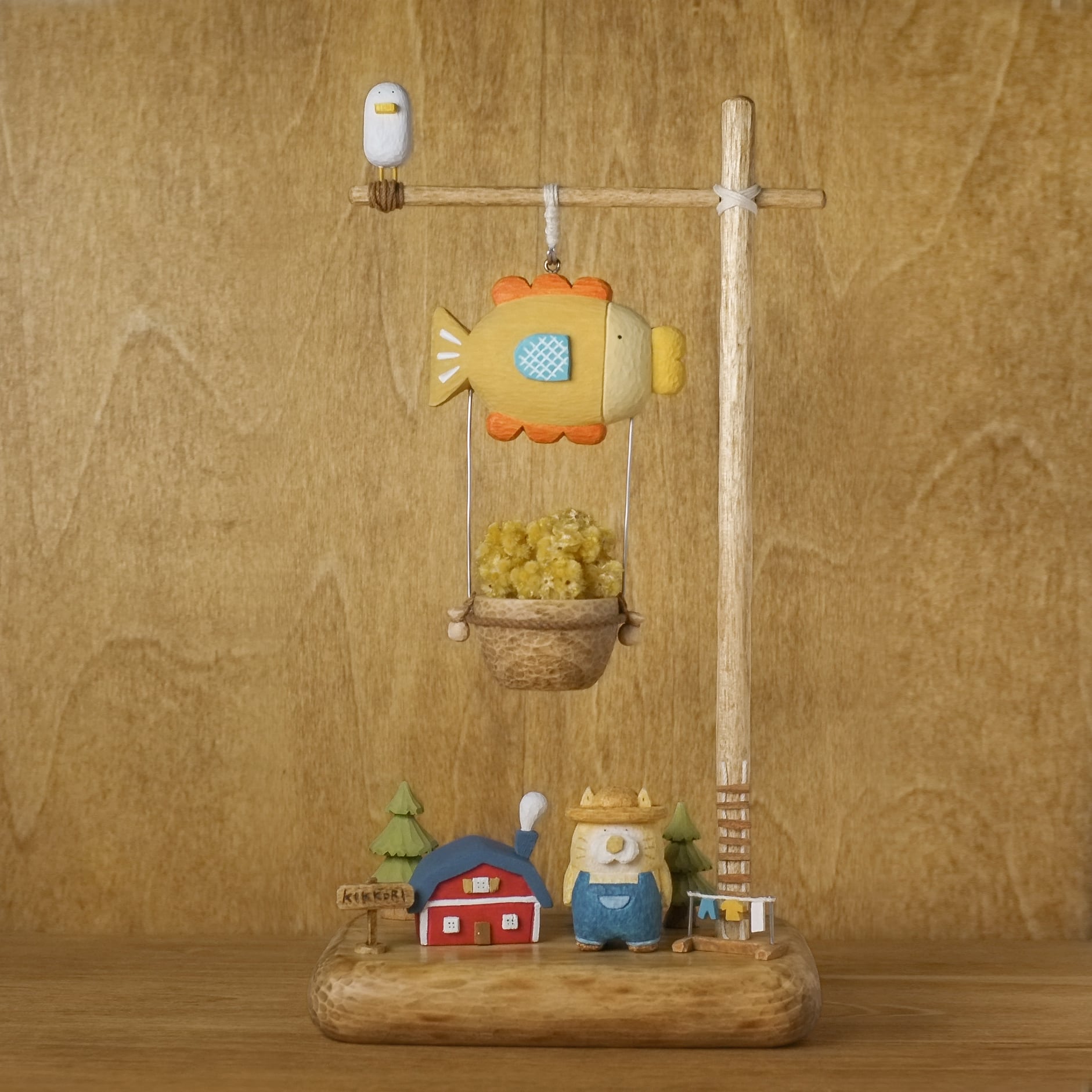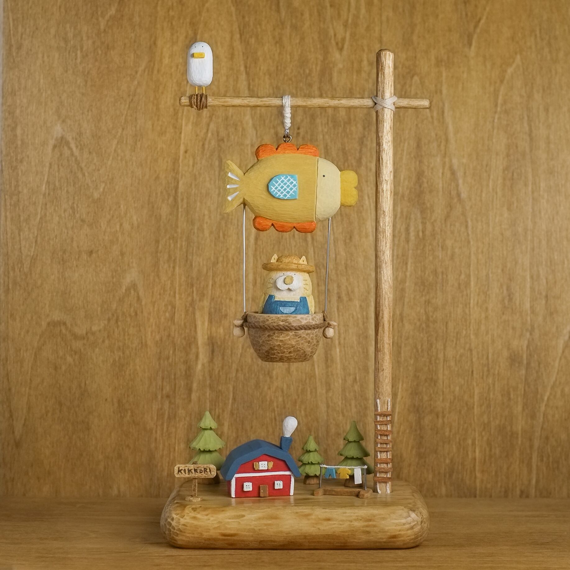 猫の木彫りがお魚の気球に乗って、